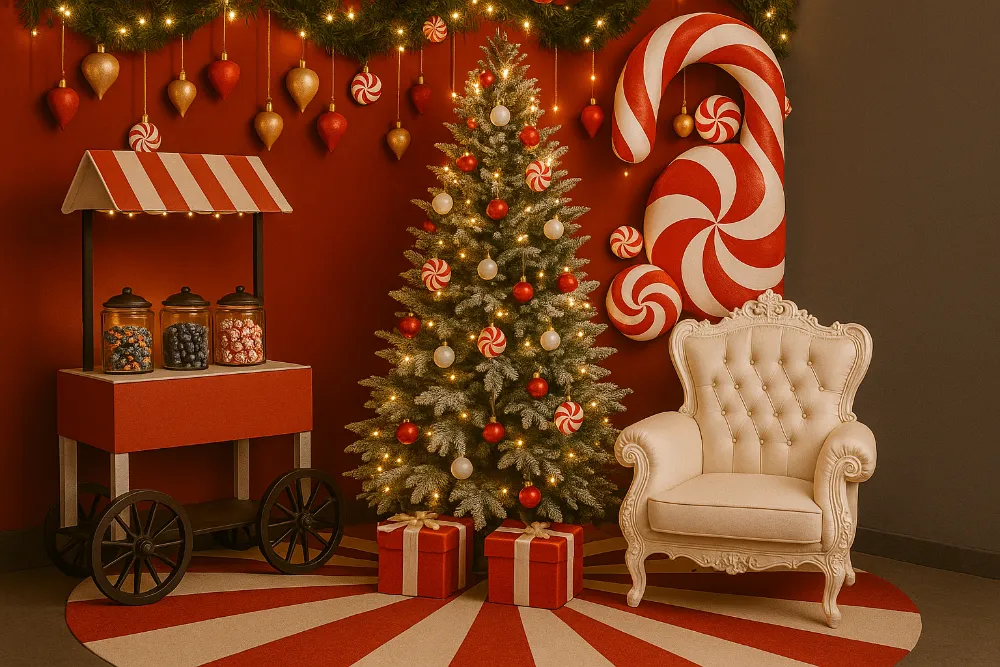 Un corner de Noël gourmand rempli de sucres d’orge géants et de bonbons rouges et blancs. Cet univers coloré est parfait pour un photobooth d’entreprise ou une pause gourmande lors de vos animations de Noël.