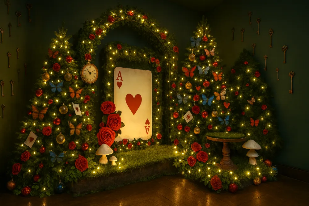 Plongez dans un monde onirique peuplé de cartes géantes, de roses rouges et de champignons géants. Les guirlandes scintillent comme des lucioles, créant une ambiance de Noël féerique qui surprendra vos invités et transformera vos bureaux en décor de conte.