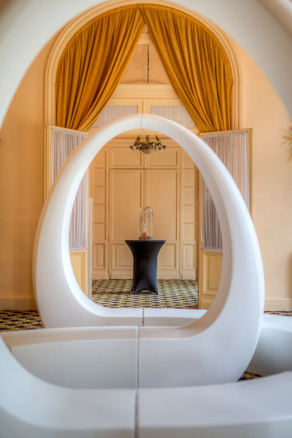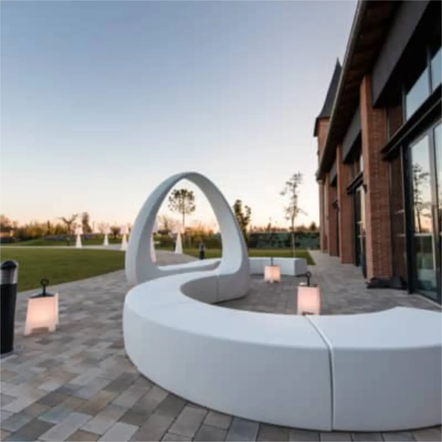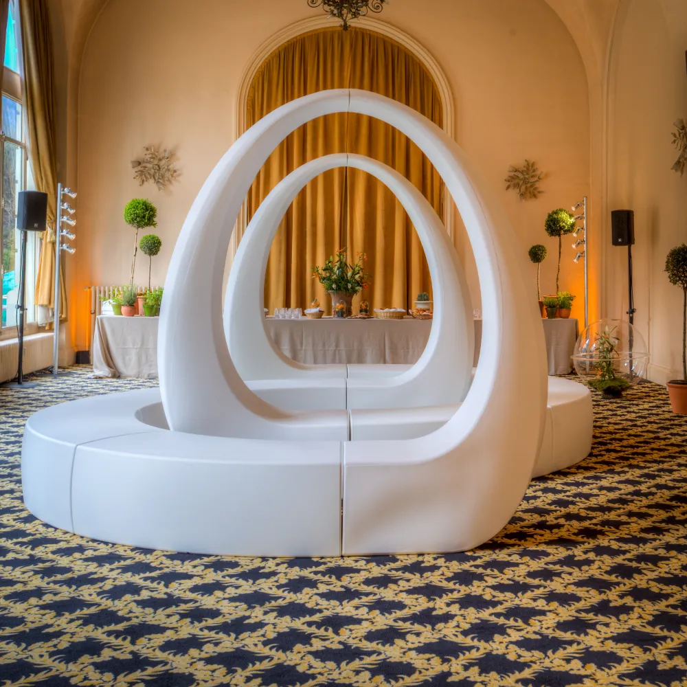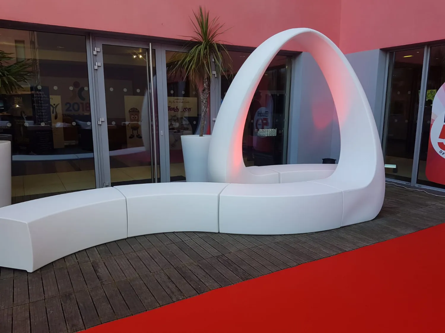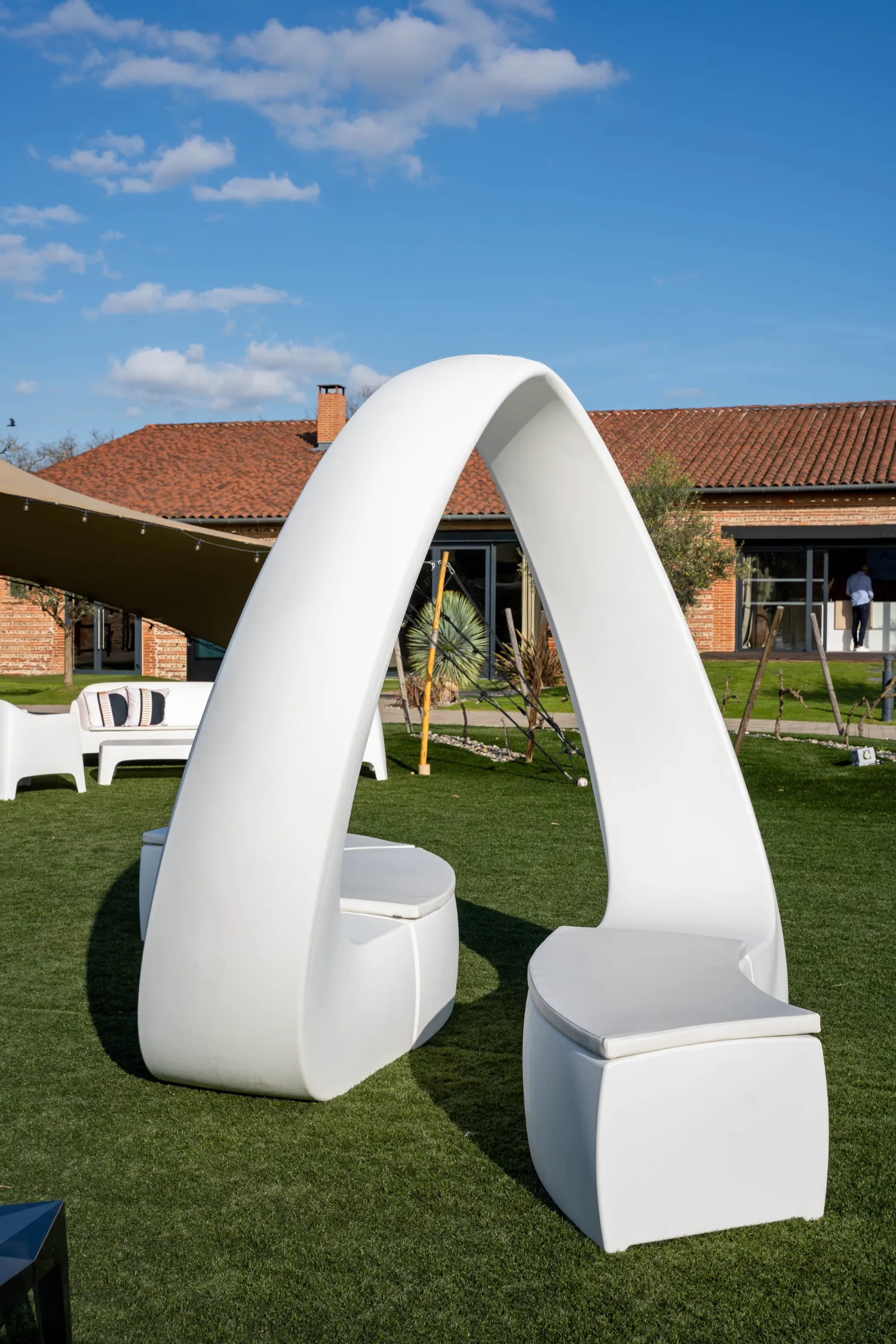 Le banc BOUCLE AND est une pièce au design architectural fort, dont la forme en arc crée une présence visuelle immédiatement reconnaissable. Élégant, minimaliste et sculptural, il structure vos espaces et apporte une touche contemporaine à n’importe quel décor événementiel. Sa silhouette épurée en fait un véritable objet de scénographie, capable de transformer une zone d’accueil, un lounge ou un parcours d’invités.