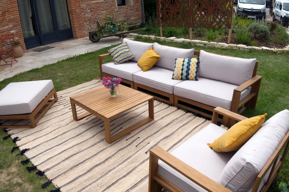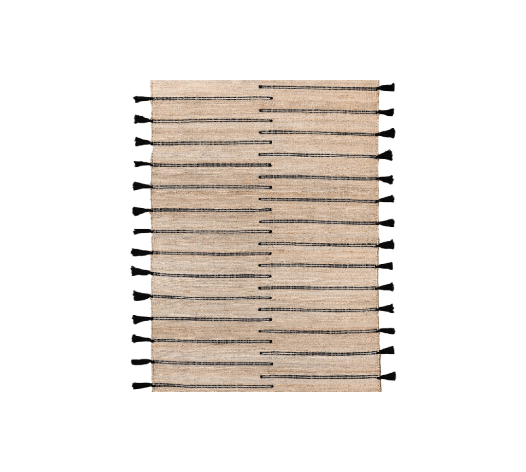 Son grand format permet de délimiter visuellement les espaces et de créer de véritables zones de vie : coin lounge, espace d’accueil, zone cocktail ou espace networking. Le contraste entre la teinte naturelle du jute et les lignes noires apporte du rythme et du relief, tout en restant harmonieux et facile à associer à des mobiliers en bois, métal ou textiles naturels.