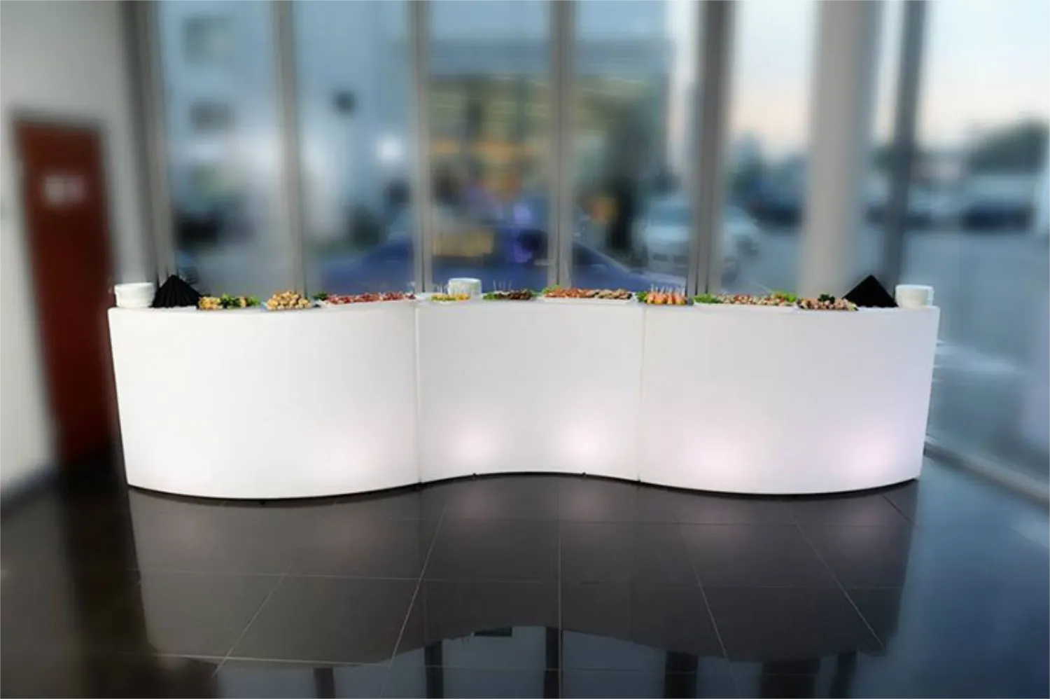 Le Snack Bar lumineux est un comptoir événementiel pensé pour allier efficacité, esthétique et impact visuel. Grâce à son éclairage intégré, il devient immédiatement un élément central de votre scénographie, apportant une ambiance moderne et chaleureuse à vos espaces de réception. Sa lumière diffuse permet de structurer l’espace, de guider les flux de circulation et de créer un point de rassemblement naturel pour vos invités.