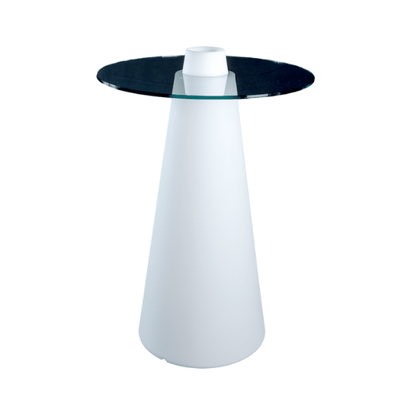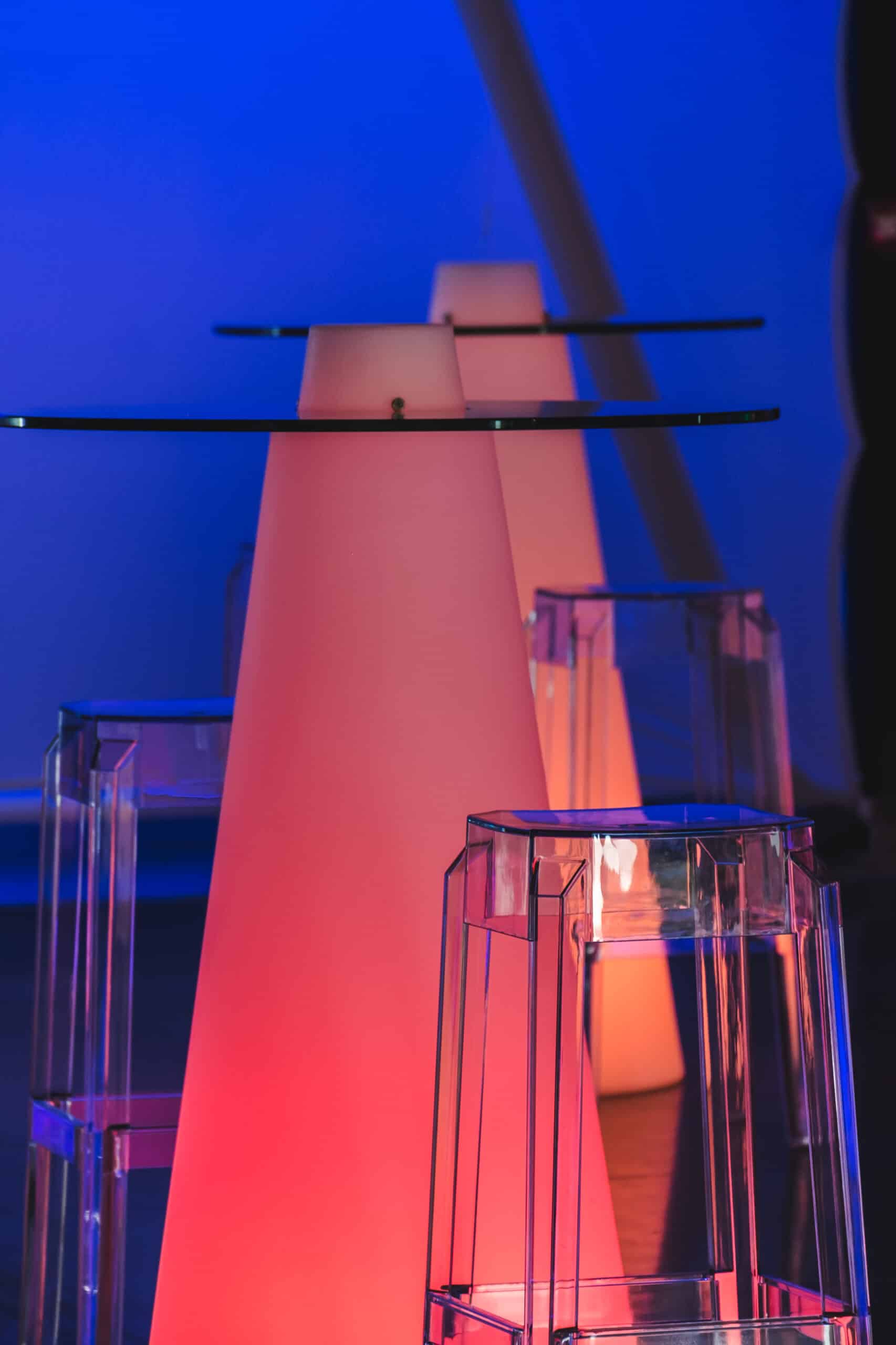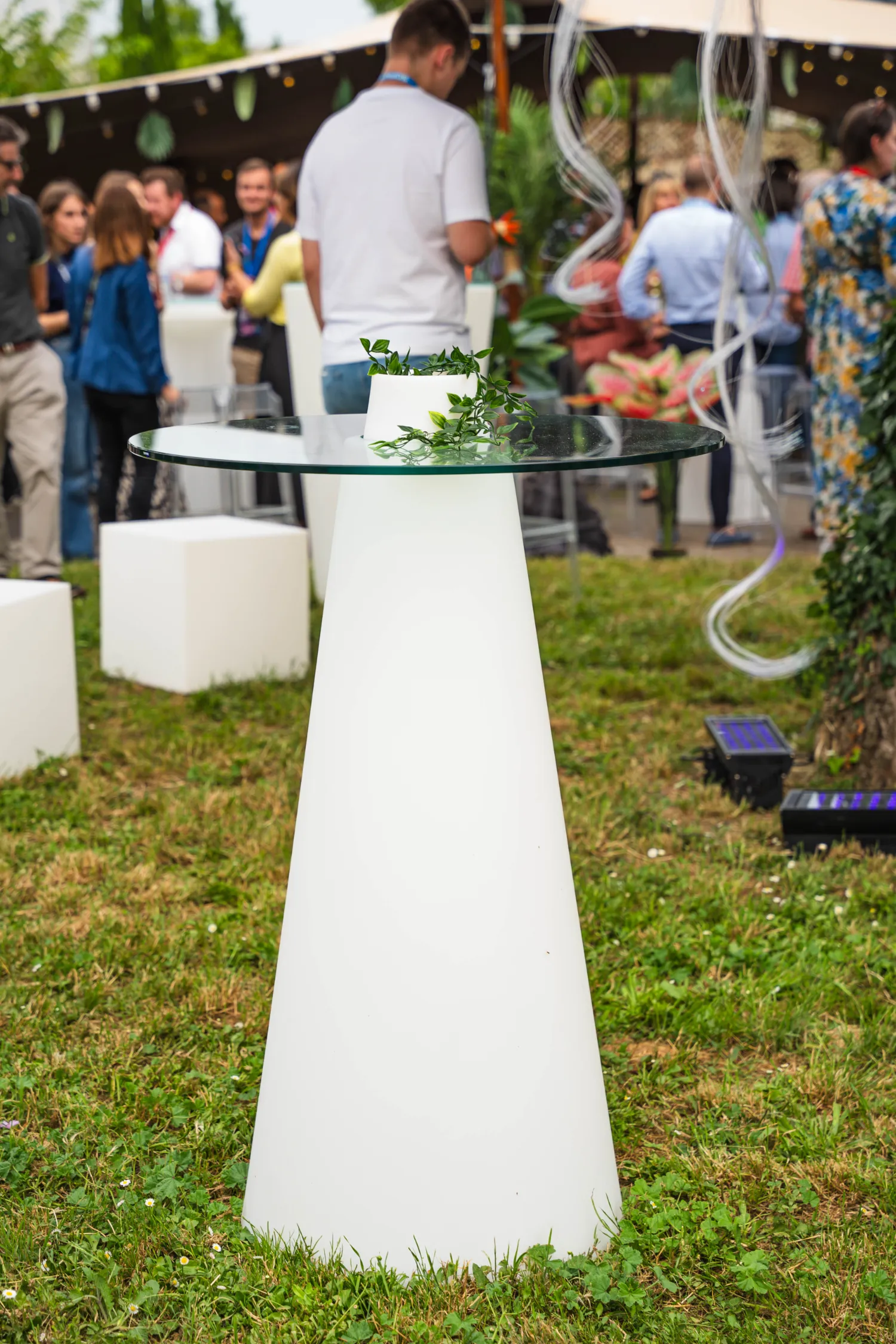 Le mange-debout PEAK lumineux, de forme conique, est conçu avec un plateau circulaire élégant ainsi qu’un porte-bouteille ou porte-fleurs intégré, offrant une fonctionnalité supplémentaire particulièrement appréciée sur les espaces de réception. Sa lumière douce diffusée par la base crée une atmosphère moderne et accueillante, idéale pour sublimer l’esthétique globale de votre événement.
