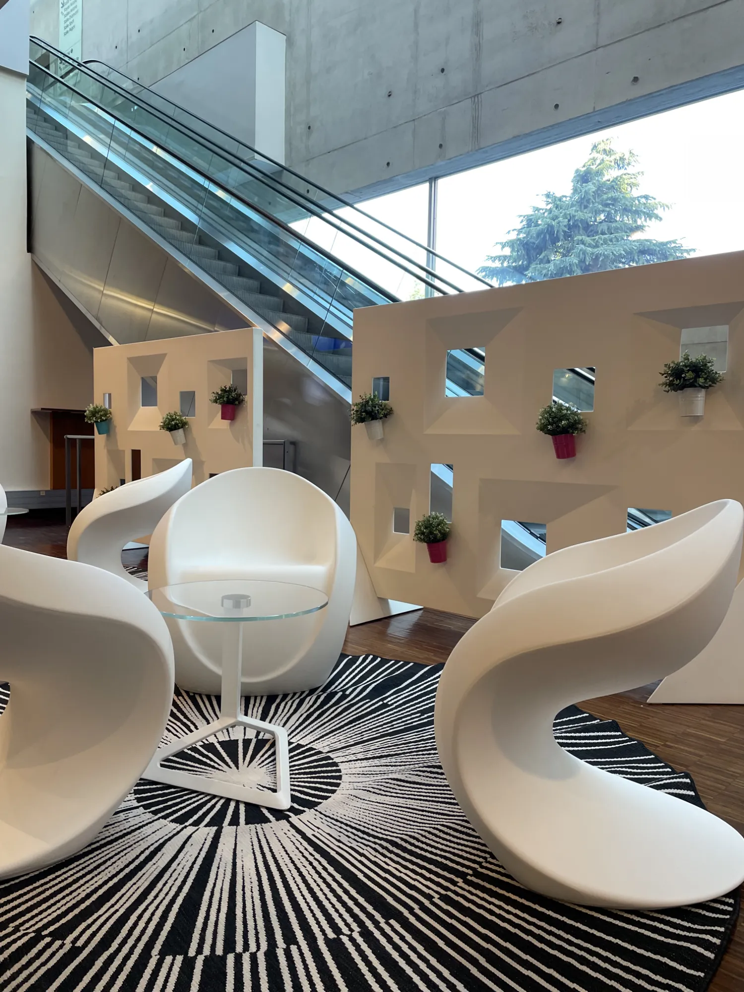 Associé à du mobilier lounge, des fauteuils design ou des tables basses, il apporte une touche sophistiquée et contemporaine, tout en améliorant le confort et la lisibilité des espaces. Son esthétique graphique en fait un choix idéal pour des événements où l’image et la scénographie jouent un rôle central.